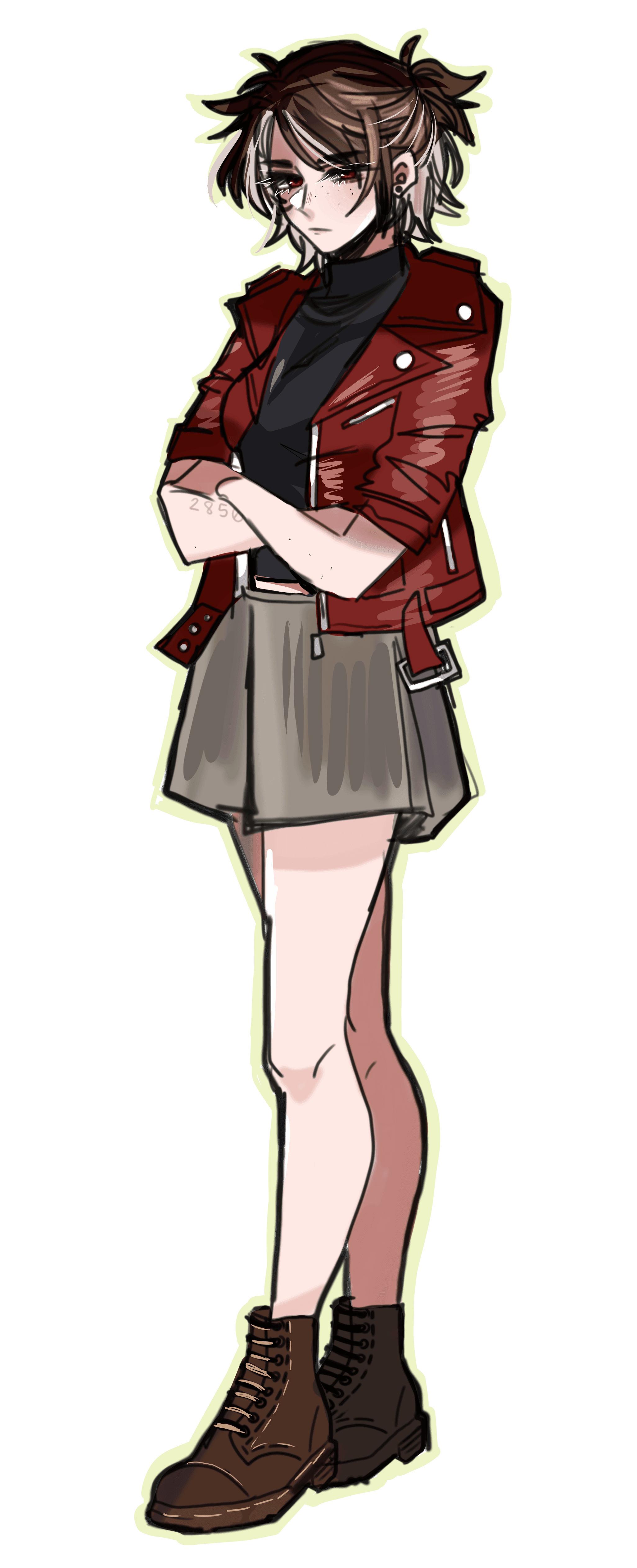 Elle aime — étrangement — bien les jupes, qu’elle trouve souple et s’abime moins quand elle se bat. Généralement, elle mets des débardeurs proches du corps, pour garder ses bras découverts.